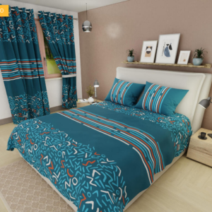 JUEGO DE SABANAS MICROFIBRA LÍNEAS ÉTNICAS FONDO AZUL Y BLANCO