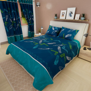 JUEGO DE SABANAS MICROFIBRA PLUMAS EN VERDE LIMON FONDO AZUL OSCURO