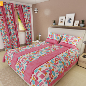 JUEGO DE SABANAS MICROFIBRA TRAZOS MOSTAZA AZUL FONDO ROSADO CON BLANCO