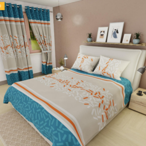 JUEGO DE SABANAS MICROFIBRAS LÍNEAS BLANCAS NARANJAS EN FONDO CAMEL Y AZUL