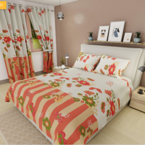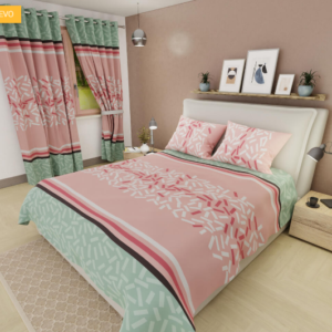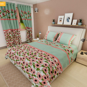 JUEGO DE SABANAS MICROFIBRA FLORES EN VERDE FONDO CORAL Y BEIG