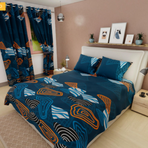 JUEGO DE SABANAS MICROFIBRA FIGURAS ABSTRACTAS NARANJAS NEGRAS FONDO AZUL OSCURO