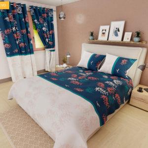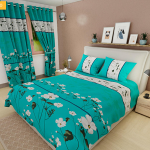 JUEGO DE SABANAS MICROFIBRA FLORES EN AZUL CIELO Y NARANJA FONDO AZUL Y BLANCO