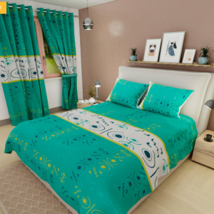 JUEGO DE SABANAS MICROFIBRA FORMAS ROBÓTICAS AMARILLAS FONDO VERDE AGUAMARINA CON FRANJA BLANCA