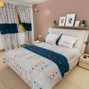 JUEGO DE SABANAS MICROFIBRA CÍRCULOS ROJOS FONDO AZUL CON BLANCO