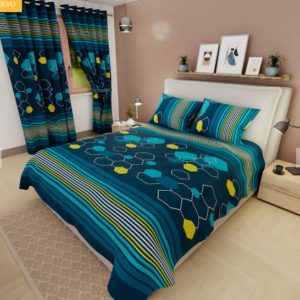 JUEGO DE SABANAS MICROFIBRA HEXÁGONOS VERDE LIMON FONDO AZUL